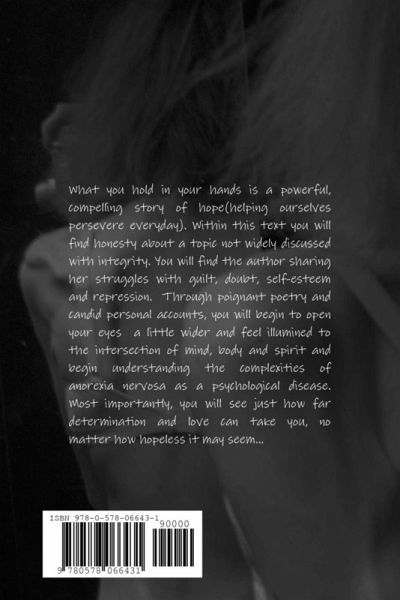 Within this text you will find honesty about a topic not widely discussed with integrity. It is a powerfully compelling story about hope and determination in the face of guilt, doubt, fear and repression. Through poignant poetry and candid personal accounts, you will begin to open your eyes a little wider and begin understanding the complexities of one of the deadliest psychological diseases, anorexia nervosa. It is not just an adolescent disease. This author and professional artist suffered as an adult and created several paintings depicting the emotional depths of this disease.... the cover is one of those pieces.