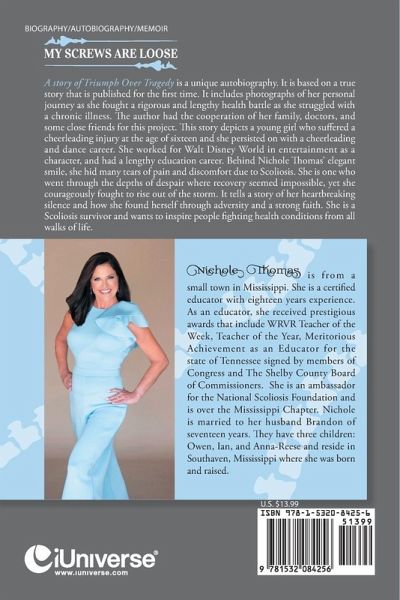 My Screws Are Loose A story of Triumph Over Tragedy is a unique autobiography. It is based on a true story that is published for the first time. It includes photographs of her personal journey as she fought a rigorous and lengthy health battle as she struggled with a chronic illness. The author had the cooperation of her family, doctors, and some close friends for this project. This story depicts a young girl who suffered a cheerleading injury at the age of sixteen and she persisted on with a cheerleading and dance career. She worked for Walt Disney World in entertainment as a character, and had a lengthy education career. Behind Nichole Thomas' elegant smile, she hid many tears of pain and discomfort due to Scoliosis. She is one who went through the depths of despair where recovery seemed impossible, yet she courageously fought to rise out of the storm. It tells a story of her heartbreaking silence and how she found herself through adversity and a strong faith. She is a Scoliosis survivor and wants to inspire people fighting health conditions from all walks of life.