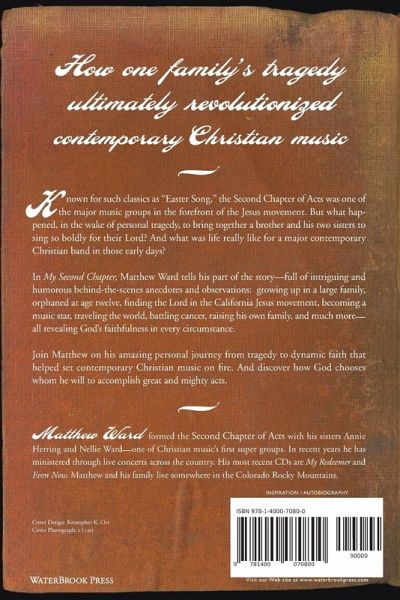 How one family's tragedy ultimately revolutionized contemporary Christian music. Known for such classics as "Easter Song,” the Second Chapter of Acts was one of the major music groups in the forefront of the Jesus movement. But what happened, in the wake of personal tragedy, to bring together a brother and his two sisters to sing so boldly for their Lord? And what was life really like for a major contemporary Christian band in those early days? In My Second Chapter, Matthew Ward tells his part of the storyfull of intriguing and humorous behind-the-scenes anecdotes and observations: growing up in a large family...orphaned at age twelve...finding the Lord in the California Jesus movement... becoming a music star...traveling the world...battling cancer...raising his own family ... and much more all revealing God's faithfulness in every circumstance. Join Matthew on his amazing personal journey from tragedy to dynamic faith that helped set contemporary Christian music on fire. And discover how God chooses whom he will to accomplish great and mighty acts.