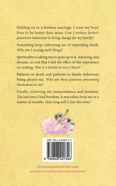 Holding on in a loveless marriage. I want my boys' lives to be better than mine. Can I endure Javier's possessive behaviour to bring change for my family? Something keeps informing me of impending death. Why am I sensing such things? Spirituality is asking me to open up to it. Amazing, real dreams, so real that I feel the effect of the experience on waking. Was it a dream or was I there? Patterns in death and patterns in family behaviour being played out. Why are these patterns presenting themselves to me? Finally, achieving my independence and freedom. The last time I had freedom, it was taken from me in a matter of months. How long will it last this time?