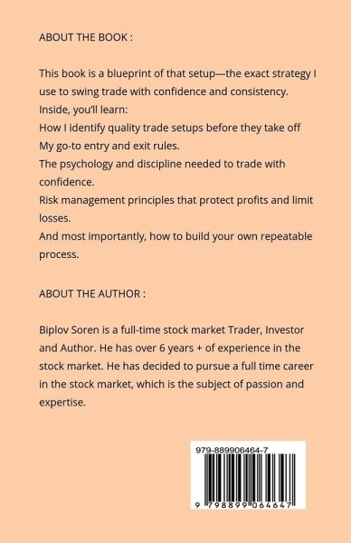 This book is a blueprint of that setup-the exact strategy I use to swing trade with confidence and consistency. These are not generic textbook strategies. They're practical, tested, and refined through real trades in real markets. I've made the mistakes, blown the accounts, and spent the screen time so you don't have to. Inside, you'll learn: How I identify quality trade setups before they take off. My go-to entry and exit rules. The psychology and discipline needed to trade with confidence. Risk management principles that protect profits and limit losses. And most importantly, how to build your own repeatable process. Whether you're a beginner or an intermediate trader looking for more structure, this book will help you focus on what works-without the noise. You don't need 10 indicators or 15 strategies. One trading strategy is enough to make money. Let's get to it.