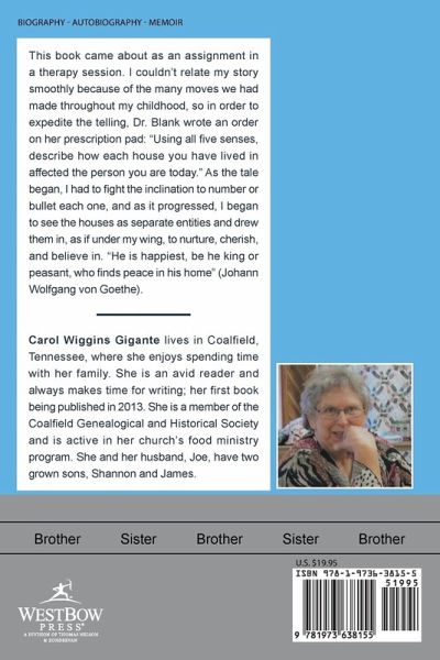 This book came about as an assignment in a therapy session. I couldn't relate my story smoothly because of the many moves we had made throughout my childhood, so in order to expedite the telling, Dr. Blank wrote an order on her prescription pad: "Using all five senses, describe how each house you have lived in affected the person you are today." As the tale began, I had to fight the inclination to number or bullet each one, and as it progressed, I began to see the houses as separate entities and drew them in, as if under my wing, to nurture, cherish, and believe in. "He is happiest, be he king or peasant, who finds peace in his home" (Johann Wolfgang von Goethe).