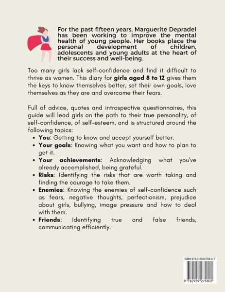 Too many girls lack self-confidence and find it difficult to thrive as women. This diary for girls aged 8 to 12 gives them the keys to know themselves better, set their own goals, love themselves as they are and fight their fears. Full of many pages of advice, quotes and introspective questionnaires, this guide will accompany the girls on the path to their true personality and is structured around the following topics: You: getting to know and accept you better. Your goals: knowing what you want and how to plan to get it. Your successes: recognizing what you've already accomplished, being grateful. Risks: identifying the risks that are worth taking and finding the courage to take them. Enemies: knowing the enemies of self-confidence such as fears, negative thoughts, perfectionism, prejudice about girls, harassment, image pressure and how to deal with them. Friends: identifying true friends, communicate calmly.
