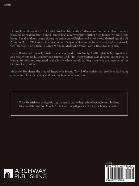 During his childhood, C. D. Griffith lived on his family's Indiana farm in the Eel River bottoms where he worked the land, hunted, and fished, never venturing further than twenty-five miles from home. But all of that changed during his senior year of high school when he was drafted into the US Army. In March 1943, with a brief stop at Fort Benjamin Harrison in Indianapolis, eighteen-year-old Griffith headed on a train to Camp White in Medford, Oregon, with a final stop in Japan. In a collection of original, unedited letters penned to his family, Griffith details his experiences as a soldier serving his country in a faraway land. His letters contain vivid descriptions of what he learned in camp and witnessed in the Pacific while bravely battling the enemy as a member of the Greatest Generation. My Senior Trip shares the original letters of a Second World War soldier that provide a fascinating glimpse into his experiences while serving his country overseas.