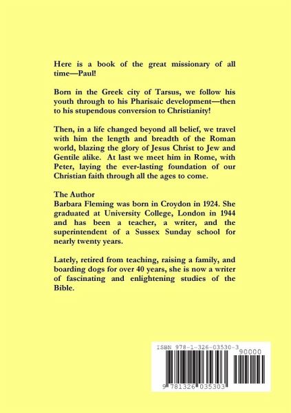 Here is a book of the great missionary of all time-Paul! Born in the Greek city of Tarsus, we follow his youth through to his Pharisaic development-then to his stupendous conversion to Christianity! Then, in a life changed beyond all belief, we travel with him the length and breadth of the Roman world, blazing the glory of Jesus Christ to Jew and Gentile alike. At last we meet him in Rome, with Peter, laying the ever-lasting foundation of our Christian faith through all the ages to come. The Author Barbara Fleming was born in Croydon in 1924. She graduated at University College, London in 1944 and has been a teacher, a writer, and the superintendent of a Sussex Sunday school for nearly twenty years. Lately, retired from teaching, raising a family, and boarding dogs for over 40 years, she is now a writer of fascinating and enlightening studies of the Bible.