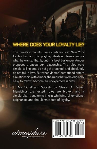 Where does your loyalty lie? This question haunts James, infamous in New York for his bar and his playboy lifestyle. James knows what he wants. That is, until his best bartender, Amber proposes a casual sex relationship. The rules were simple: tell no one, do not get attached, and absolutely do not fall in love. But when James' best friend enters a relationship with Amber, the rules that were originally easy to follow, become an unexpected liability. In My Significant Nobody, by Stevie D. Parker, friendships are tested, rules are broken, and a simple plan transforms into a whirlwind of emotions, epiphanies and the ultimate test of loyalty.