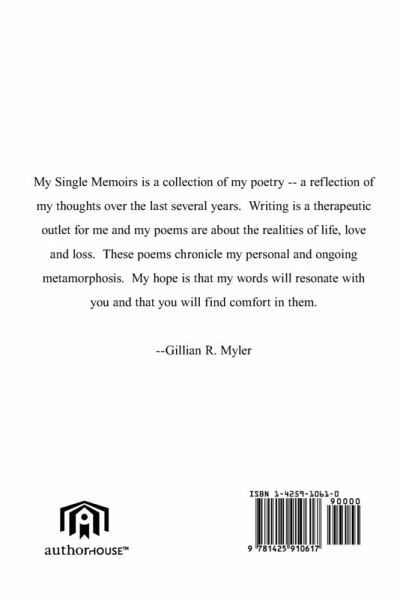 My Single Memoirs is a collection of my poetry -- a reflection of my thoughts over the last several years. Writing is a therapeutic outlet for me and my poems are about the realities of life, love and loss. These poems chronicle my personal and ongoing metamorphosis. My hope is that my words will resonate with you and that you will find comfort in them. --Gillian R. Myler