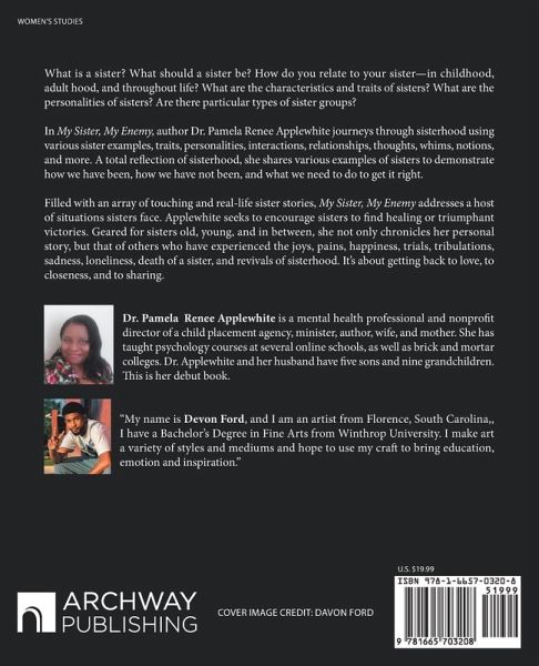 What is a sister? What should a sister be? How do you relate to your sister-in childhood, adult hood, and throughout life? What are the characteristics and traits of sisters? What are the personalities of sisters? Are there particular types of sister groups? In My Sister, My Enemy, author Dr. Pamela Renee Applewhite journeys through sisterhood using various sister examples, traits, personalities, interactions, relationships, thoughts, whims, notions, and more. A total reflection of sisterhood, she shares various examples of sisters to demonstrate how we have been, how we have not been, and what we need to do to get it right. Filled with an array of touching and real-life sister stories, My Sister, My Enemy addresses a host of situations sisters face. Applewhite seeks to encourage sisters to find healing or triumphant victories. Geared for sisters old, young, and in between, she not only chronicles her personal story, but that of others who have experienced the joys, pains, happiness, trials, tribulations, sadness, loneliness, death of a sister, and revivals of sisterhood. It's about getting back to love, to closeness, and to sharing.
