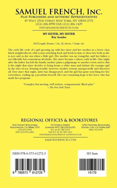 Full Length, Drama Characters: 1 male, 3 female, chorus. Interior The early life cycle of a girl growing up with her sister and her mother in a lower class black neighborhood, with scenes switching back and forth in time to show her both as she is now and as she was when a little girl. Her mother was an evangelist, and her father a very likeable but contentious alcoholic. Her sister became a whore early in life. One night after the father has left the family, mother plans a pilgrimage to another town; and so this is the night that sister decides to bring home a white man and initiate the younger girl in the rites of sex. Sensing trouble, however, mother returns unexpectedly and discovers all. Ever since that night, sister has disappeared, and the girl has gone searching for her everywhere, ending up a prostitute herself. Her one remaining hope is her lover, who has made her pregnant. "Complex but moving, well written, compassionate Black play." N.Y. Times.