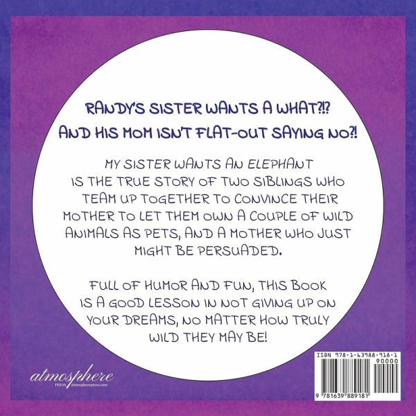 Randy's sister wants a WHAT?!? And his Mom isn't flat-out saying no?! My Sister Wants an Elephant is the true story of two siblings who team up together to convince their mother to let them own a couple of wild animals as pets, and a mother who just might be persuaded. Full of humor and fun, this book is a good lesson in not giving up on your dreams, no matter how truly wild they may be!
