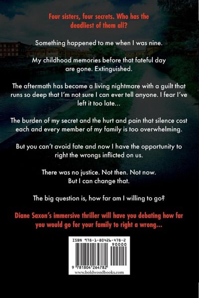 Pre-order the BRAND NEW psychological thriller from the bestselling author of My Little Brother.Four sisters, four secrets. Who has the deadliest of them all? Something happened to me when I was nine. My childhood memories before that fateful day are gone. Extinguished. The aftermath has become a living nightmare with a guilt that runs so deep that I'm not sure I can ever tell anyone. I fear I've left it too late... The burden of my secret and the hurt and pain that silence cost each and every member of my family is too overwhelming. But you can't avoid fate and now I have the opportunity to right the wrongs inflicted on us. There was no justice. Not then. Not now. But I can change that. The big question is, how far am I willing to go? Diane Saxon's immersive thriller will have you debating how far you would go for your family to right a wrong...