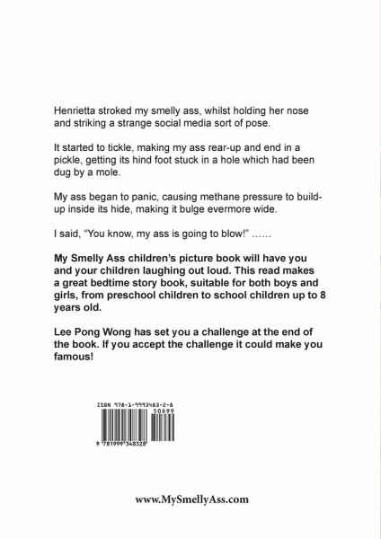'Henrietta stroked my smelly ass (donkey), whilst holding her nose and striking a strange social media sort of pose. It started to tickle, making my ass rear-up and end in a pickle, getting its hind foot stuck in a hole which had been dug by a mole. My ass began to panic, causing methane pressure to build-up inside its hide, making it bulge evermore wide. I said, "You know, my ass is going to blow!" She started to frown and we prepared to drown in a pungent sea of flatulence, whilst I feared the sonic booms might destroy all the rooms in the nearby town. Then, like a thousand football stadiums of flatulent fans all blowing off together in perfect harmony, my ass suffered a major gas leak, leaving us unable to even speak. It was so so loud, but my ass looked so so proud. Unfortunately, at that very moment a passer-by tossed his burning cigarette butt up high, falling into the gas cloud from the sky. His butt detonated a big bang and the whole universe rang, as my ass sent out a shockwave of flaming ass radiation which knocked us off our feet and into the street. Looking up, I felt a little proud that my smelly ass had produced such a huge mushroom cloud. Still in a daze, I got my ass back on its feet in the haze, whilst all around us was now ablaze, as Henrietta screamed, "My ass is on fire!" ….' Can anyone save Henrietta's ass? Will my smelly ass ever escape the hole dug by a mole? My Smelly Ass children's picture book will have you and your children laughing out loud. This read makes a great bedtime story book for any kid. Suitable for both boys and girls, from preschool kids to early school children ages 3, 4, 5, 6 and 7 to age 8 years old.