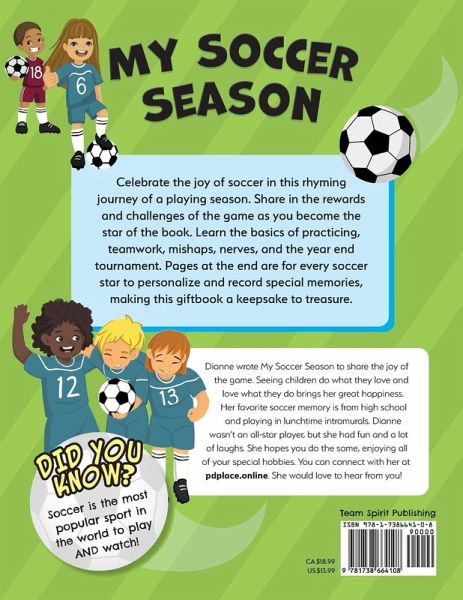 Celebrate the joy of soccer in this rhyming journey of a playing season! Your special soccer player will share in the rewards and challenges of the game as they become the star in this book. MY SOCCER SEASON will inspire young soccer players to follow their dreams and develop a love of the game. With bonus pages to personalize, it's a book they will want to read over and over. MY SOCCER SEASON will help young soccer enthusiasts to discover and learn the basics of: Being part of a team Practicing and perseverance How to handle mishaps and nerves Soccer vocabulary Preparing for and playing in the year end tournament Most importantly*** playing to have fun*** The title page and pages at the end are for personalizing and recording special memories. Players will love:Creating a full-page soccer card with stats from the year. Collecting autographs from teammates, coaches, and maybe even a few soccer stars. Recording highlights from the season including: funniest moment and best thing that happened during the year names of coaches, teammates favorite pro team and player favorite soccer tricks, and more MY SOCCER SEASON is a gift book that is sure to become a keepsake to treasure. Order your copy today, to delight and encourage your favorite soccer player for many years to come.