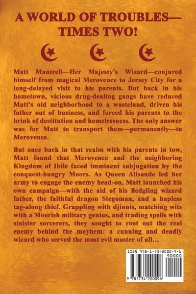 A WORLD OF TROUBLES - TIMES TWO!Matt Mantrell -- Her Majesty's Wizard -- conjured himself from magical Merovence to Jersey City for a long-delayed visit to his parents. Back in his hometown vicious, drug-dealing gangs had reduced Matt's old neighborhood to a wasteland, driven his father out of business, and forced his parents to the brink of destitution and homelessness. The only answer was for Matt to transport them -- permanently -- to Merovence.But once back in that realm with his parents in tow, Matt found that Merovence and the neighboring Kingdom of Ibile faced imminent subjugation by the conquest-hungry Moors. As Queen Alisande led her army to engage the enemy head-on, Matt launched his own campaign -- with the aid of his fledgling wizard father, the faithful dragon Stegoman, and a hapless tag-along thief. Grappling with djinnis, matching wits with a Moorish military genius, and trading spells with sinister sorcerers, they sought to root out the real enemy behind the mayhem: a cunning and deadly wizard who served the most evil master of all . . .