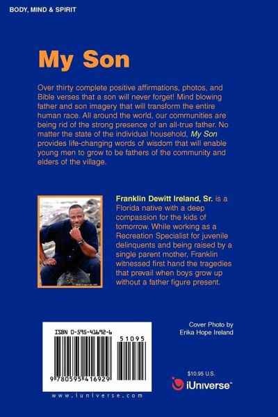 Over thirty complete positive affirmations, photos, and Bible verses that a son will never forget! Mind blowing father and son imagery that will transform the entire human race. All around the world, our communities are being rid of the strong presence of an all-true father. No matter the state of the individual household, My Son provides life-changing words of wisdom that will enable young men to grow to be fathers of the community and elders of the village.
