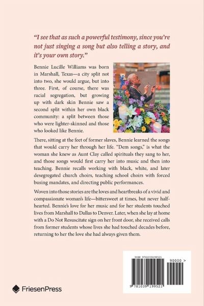 "I see that as such a powerful testimony, since you're not just singing a song but also telling a story, and it's your own story." Bennie Lucille Williams was born in Marshall, Texas-a city split not into two, she would argue, but into three. First, of course, there was racial segregation, but growing up with dark skin Bennie saw a second split within her own black community: a split between those who were lighter-skinned and those who looked like Bennie. There, sitting at the feet of former slaves, Bennie learned the songs that would carry her through her life. "Dem songs," is what the woman she knew as Aunt Clay called spirituals they sang to her, and those songs would first carry her into music and then into teaching. Bennie recalls working with black, white, and later desegregated church choirs, teaching school choirs with forced busing mandates, and directing public performances. Woven into those stories are the loves and heartbreaks of a vivid and compassionate woman's life-bittersweet at times, but never half-hearted. Bennie's love for her music and for her students touched lives from Marshall to Dallas to Denver. Later, when she lay at home with a Do Not Resuscitate sign on her front door, she received calls from former students whose lives she had touched decades before, returning to her the love she had always given them.
