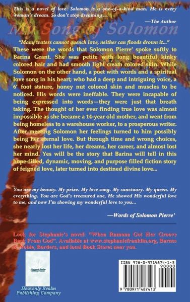 My Song of Solomon is a story of true love. "Many waters cannot quench love neither can floods drown it..." These were the words that Solomon Pierre' spoke softly to Barina Grant. She was petite with long beautiful kinky colored hair and had smooth light cream colored skin. While Solomon on the other hand, a poet with words and a spiritual love song in his heart; who had a deep and intriguing voice, a 6' foot stature, honey nut colored skin and muscles to be noticed. His words were ineffable. They were incapable of being expressed into words--they were just that breath taking. The thought of her ever finding true love was almost impossible as she became a 14-year old mother, and went from being homeless to a warehouse worker, to a properous writer. After meeting Solomon her feelings turned to him possibly being her eternal love. But through time and wrong choices, she nearly lost her life, her dreams, her career, and almost lost her mind. Yes will be the story that Barina will tell in this hope-filled, dynamic, moving, and purpose filled fiction story of feigned love, later turned into destined divine love...
