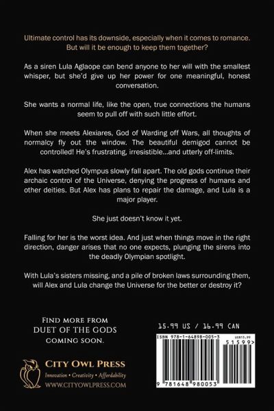 Ultimate control has its downside, especially when it comes to romance. But will it be enough to keep them together? As a siren Lula Aglaope can bend anyone to her will with the smallest whisper, but she'd give up her power for one meaningful, honest conversation. She wants a normal life, like the open, true connections the humans seem to pull off with such little effort. When she meets Alexiares, God of Warding off Wars, all thoughts of normalcy fly out the window. The beautiful demigod cannot be controlled! He's frustrating, irresistible...and utterly off-limits. Alex has watched Olympus slowly fall apart. The old gods continue their archaic control of the Universe, denying the progress of humans and other deities. But Alex has plans to repair the damage, and Lula is a major player. She just doesn't know it yet. Falling for her is the worst idea. And just when things move in the right direction, danger arises that no one expects, plunging the sirens into the deadly Olympian spotlight. With Lula's sisters missing, and a pile of broken laws surrounding them, will Alex and Lula change the Universe for the better or destroy it? If you like Kevin Hearne, Molly Harper, and Shannon Mayer, you'll love this fun paranormal romance steeped in mythology!