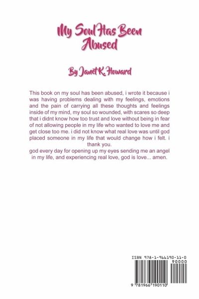THIS BOOK ON MY SOUL HAS BEEN ABUSED, I WROTE IT BECAUSE I WAS HAVING PROBLEMS DEALING WITH MY FEELINGS, EMOTIONS AND THE PAIN OF CARRYING ALL THESE THOUGHTS AND FEELINGS INSIDE OF MY MIND, MY SOUL SO WOUNDED, WITH SCARES SO DEEP THAT I DIDNT KNOW HOW TOO TRUST AND LOVE WITHOUT BEING IN FEAR OF NOT ALLOWING PEOPLE IN MY LIFE WHO WANTED TO LOVE ME AND GET CLOSE TOO ME. I DID NOT KNOW WHAT REAL LOVE WAS UNTIL GOD PLACED SOMEONE IN MY LIFE THAT WOULD CHANGE HOW I FELT. I THANK YOU GOD EVERY DAY FOR OPENING UP MY EYES SENDING ME AN ANGEL IN MY LIFE, AND EXPERIENCING REAL LOVE, GOD IS LOVE... AMEN