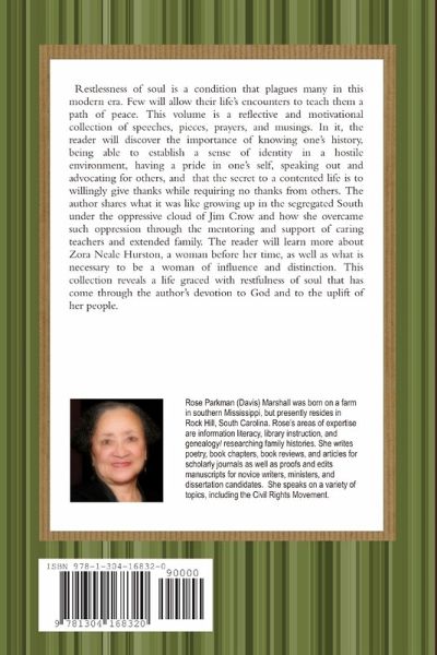 This volume is a reflective and motivational collection of speeches, pieces, prayers, and musings. In it, the reader will discover the importance of knowing one's history, being able to establish a sense of identity in a hostile environment, having pride in one's self, speaking out and advocating for others, and that the secret to a contented life is to willingly give thanks while requiring no thanks from others. The author shares what it was like growing up in the segregated south under the oppressive cloud of Jim Crow and how she overcame such oppression through the mentoring and support of caring teachers and extended family.
