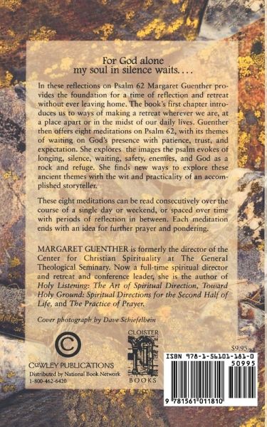 "For God alone my soul in silence waits...." In these reflections on Psalm 62 Margaret Guenther provides the foundation for a time of reflection and retreat without ever leaving home. The book's first chapter introduces us to ways of making a retreat wherever we are, at a place apart or in the midst of our daily lives. Guenther then offers eight meditations on Psalm 62, with its themes of waiting on God's presence with patience, trust, and expectation. She explores the images the psalm evokes of longing, silence, waiting, safety, enemies, and God as a rock and refuge. As in all her books, Guenther finds new ways to explore these ancient themes with the wit and practicality of an accomplished storyteller. These eight meditations can be read consecutively over the course of a single day or weekend, or spaced over time with periods of reflection in between. Each meditation ends with ideas for further prayer and pondering. My Soul in Silence Waits is one of our series of Cowley Cloister Books: smaller format, gift edition books designed for meditative and devotional reading.