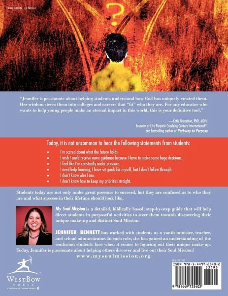 "Jennifer is passionate about helping students understand how God has uniquely created them. Her wisdom steers them into colleges and careers that "fit" who they are. For any educator who wants to help young people make an eternal impact in this world, this is your definitive tool." -Katie Brazelton, PhD, MDiv, founder of Life Purpose Coaching Centers International®, and bestselling author of Pathway to Purpose Today, it is not uncommon to hear the following statements from students: ¿ I'm scared about what the future holds. ¿ I wish I could receive more guidance because I have to make some huge decisions. ¿ I feel like I'm constantly under pressure. ¿ I need help focusing; I have set goals for myself, but I don't follow through. ¿ I don't know who I am. ¿ I don't know how to keep my priorities straight. Students today are not only under great pressure to succeed, but they are confused as to who they are and what success in their lifetime should look like. My Soul Mission is a detailed, biblically based, step-by-step guide that will help direct students in purposeful activities to steer them towards discovering their unique make-up and distinct Soul Mission.