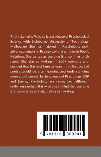 Rifatin Lorraine Wachjo is a graduate of Psychological Science with Swinburne University of Technology Melbourne. She has majored in Psychology, took advanced minors in Psychology and a minor in Public Relations. She writes as Lorraine Branson, her birth name. She started writing in 2007 onwards and decided that the best time to launch this first part of poetry would be after learning and understanding more about people. In the science of Psychology, ESP and Energy Psychology are recognised, although under researched. It is with this in mind that Lorraine Branson shares an insight into spirit writing.