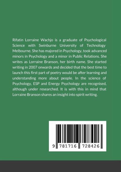 Rifatin Lorraine Wachjo is a graduate of Psychological Science with Swinburne University of Technology Melbourne. She has majored in Psychology, took advanced minors in Psychology and a minor in Public Relations. She writes as Lorraine Branson, her birth name. She started writing in 2007 onwards and decided that the best time to launch this first part of poetry would be after learning and understanding more about people. In the science of Psychology, ESP and Energy Psychology are recognised, although under researched. It is with this in mind that Lorraine Branson shares an insight into spirit writing.