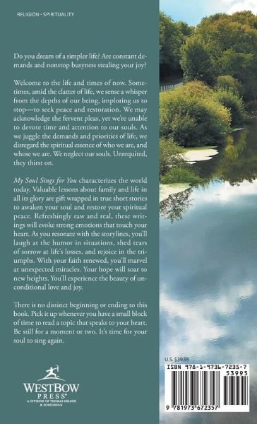 Do you dream of a simpler life? Are constant demands and nonstop busyness stealing your joy? Welcome to the life and times of now. Sometimes, amid the clatter of life, we sense a whisper from the depths of our being, imploring us to stop-to seek peace and restoration. We may acknowledge the fervent pleas, yet we're unable to devote time and attention to our souls. As we juggle the demands and priorities of life, we disregard the spiritual essence of who we are, and whose we are. We neglect our souls. Unrequited, they thirst on. My Soul Sings for You characterizes the world today. Valuable lessons about family and life in all its glory are gift wrapped in true short stories to awaken your soul and restore your spiritual peace. Refreshingly raw and real, these writings will evoke strong emotions that touch your heart. As you resonate with the storylines, you'll laugh at the humor in situations, shed tears of sorrow at life's losses, and rejoice in the triumphs. With your faith renewed, you'll marvel at unexpected miracles. Your hope will soar to new heights. You'll experience the beauty of unconditional love and joy. There is no distinct beginning or ending to this book. Pick it up whenever you have a small block of time to read a topic that speaks to your heart. Be still for a moment or two. It's time for your soul to sing again.