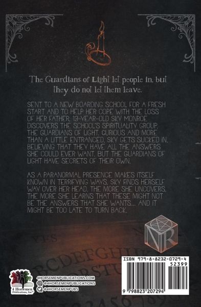 The Guardians of Light let people in, but they do not let them leave. Sent to a new boarding school for a fresh start and to help her cope with the loss of her father, 13-year-old Sky Monroe discovers the school's spirituality group, The Guardians of Light. Curious and more than a little entranced, Sky gets sucked in, believing that they have all the answers she could ever want. But the Guardians of Light have secrets of their own. As a paranormal presence makes itself known in terrifying ways, Sky finds herself way over her head. The more she uncovers, the more she learns that these might not be the answers that she wants... and it might be too late to turn back.