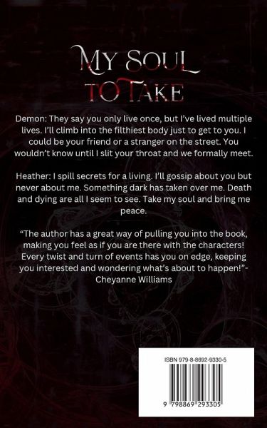 Demon: They say you only live once, but I've lived multiple lives. I'll climb into the filthiest body just to get to you. I could be your friend or a stranger on the street. You wouldn't know until I slit your throat and we formally meet. Heather: I spill secrets for a living. I'll gossip about you but never about me. Something dark has taken over me. Death and dying are all I seem to see. Take my soul and bring me peace. "The author has a great way of pulling you into the book, making you feel as if you are there with the characters! Every twist and turn of events has you on edge, keeping you interested and wondering what's about to happen!"- Cheyanne Williams