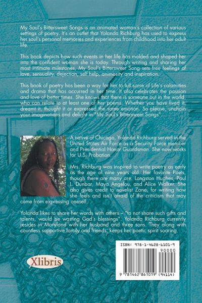 My Soul's Bittersweet Songs is an animated woman's collection of various settings of poetry. It's an outlet that Yolanda Richburg has used to express her soul's personal memories and experiences from childhood into her adult life. This book depicts how such events in her life has molded and shaped her into the confident woman she is today. Through writing and sharing her most intimate milestones, My Soul's Bittersweet Song sets free feelings of love, sensuality, dejection, self help, animosity and inspiration. This book of poetry has been a way for her to lull some of Life's calamities and drama that has occurred in her time. It also celebrates the passion and love of better times. She knows that there is someone out in the world, who can relate to at least one of her poems. Whether you have lived it, dreamt it, thought it or expressed the same emotion. So please, unchain your imaginations and delight in "My Soul's Bittersweet Songs".