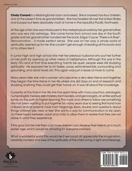 This book was brought to light because I felt the need to help children understand more about the gifts they may have and may not know how to deal with or even what they are. They need to know they are special and not strange or different. They need to know that everyone has these gifts but that not everyone is aware of them. They can learn not to be afraid and that they are indeed blessed. Too many times, children can shut down or not even want to be around people due to not understanding what is going on with the things they may see, hear, feel, or remember. Putting stories in book form, along with pictures, gives parents a way to connect with their children and then open up for conversation, thus taking away any fears or doubts. Learning more about themselves and their special gifts will help them reach their full potential toward their own spirituality and, at some point in their lives, be able to be there for someone else.
