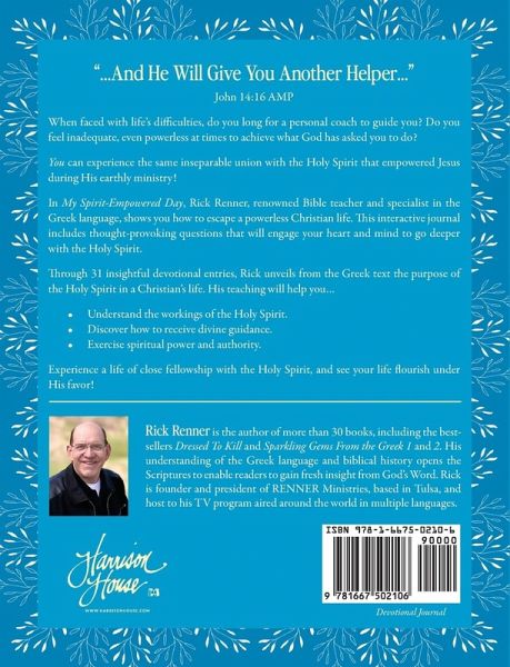 "...And He Will Give You Another Helper..." John 14:16 AMP When faced with life's difficulties, do you long for a personal coach to guide you? Do you feel inadequate, even powerless at times to achieve what God has asked you to do? You can experience the same inseparable union with the Holy Spirit that empowered Jesus during His earthly ministry! In My Spirit-Empowered Day, Rick Renner, renowned Bible teacher and specialist in the Greek language, shows you how to escape a powerless Christian life. This interactive journal includes thought-provoking questions that will engage your heart and mind to go deeper with the Holy Spirit. Through 31 insightful devotional entries, Rick unveils from the Greek text the purpose of the Holy Spirit in a Christian's life. His teaching will help you... Understand the workings of the Holy Spirit. Discover how to receive divine guidance. Exercise spiritual power and authority. Experience a life of close fellowship with the Holy Spirit, and see your life flourish under His favor!