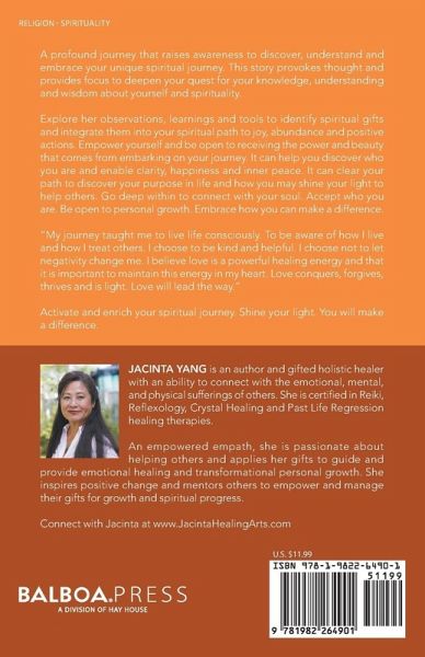A profound journey that raises awareness to discover, understand and embrace your unique spiritual journey. This story provokes thought and provides focus to deepen your quest for your knowledge, understanding and wisdom about yourself and spirituality. Explore her observations, learnings and tools to identify spiritual gifts and integrate them into your spiritual path to joy, abundance and positive actions. Empower yourself and be open to receiving the power and beauty that comes from embarking on your journey. It can help you discover who you are and enable clarity, happiness and inner peace. It can clear your path to discover your purpose in life and how you may shine your light to help others. Go deep within to connect with your soul. Accept who you are. Be open to personal growth. Embrace how you can make a difference. "My journey taught me to live life consciously. To be aware of how I live and how I treat others. I choose to be kind and helpful. I choose not to let negativity change me. I believe love is a powerful healing energy and that it is important to maintain this energy in my heart. Love conquers, forgives, thrives and is light. Love will lead the way." Activate and enrich your spiritual journey. Shine your light. You will make a difference.