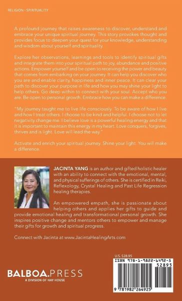 A profound journey that raises awareness to discover, understand and embrace your unique spiritual journey. This story provokes thought and provides focus to deepen your quest for your knowledge, understanding and wisdom about yourself and spirituality. Explore her observations, learnings and tools to identify spiritual gifts and integrate them into your spiritual path to joy, abundance and positive actions. Empower yourself and be open to receiving the power and beauty that comes from embarking on your journey. It can help you discover who you are and enable clarity, happiness and inner peace. It can clear your path to discover your purpose in life and how you may shine your light to help others. Go deep within to connect with your soul. Accept who you are. Be open to personal growth. Embrace how you can make a difference. "My journey taught me to live life consciously. To be aware of how I live and how I treat others. I choose to be kind and helpful. I choose not to let negativity change me. I believe love is a powerful healing energy and that it is important to maintain this energy in my heart. Love conquers, forgives, thrives and is light. Love will lead the way." Activate and enrich your spiritual journey. Shine your light. You will make a difference.