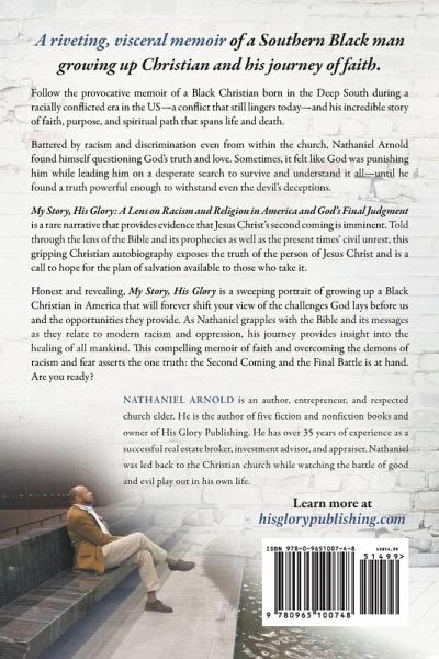 A riveting, visceral memoir of a Southern Black man growing up Christian and his journey of faith. Follow the provocative memoir of a Black Christian born in the Deep South during a racially conflicted era in the US-a conflict that still lingers today-and his incredible story of faith, purpose, and spiritual path that spans life and death. Battered by racism and discrimination even from within the church, Nathaniel Arnold found himself questioning God's truth and love. Sometimes, it felt like God was punishing him while leading him on a desperate search to survive and understand it all-until he found a truth powerful enough to withstand even the devil's deceptions. My Story, His Glory: A Lens on Racism and Religion in America and God's Final Judgment is a rare narrative that provides evidence that Jesus Christ's Second Coming is imminent. Told through the lens of the Bible and its prophecies as well as the present times' civil unrest, this gripping Christian autobiography exposes the Truth of the Person of Jesus Christ and is a call to hope for the plan of salvation available to those who take it. Honest and revealing, My Story, His Glory is a sweeping portrait of growing up a Black Christian in America that will forever shift your view of the challenges God lays before us and the opportunities they provide. As Nathaniel grapples with the Bible and its messages as they relate to modern racism and oppression, his journey provides insight into the healing of all mankind. This compelling memoir of faith and overcoming the demons of racism and fear asserts the one truth: the Second Coming and the Final Battle is at hand. Are you ready?