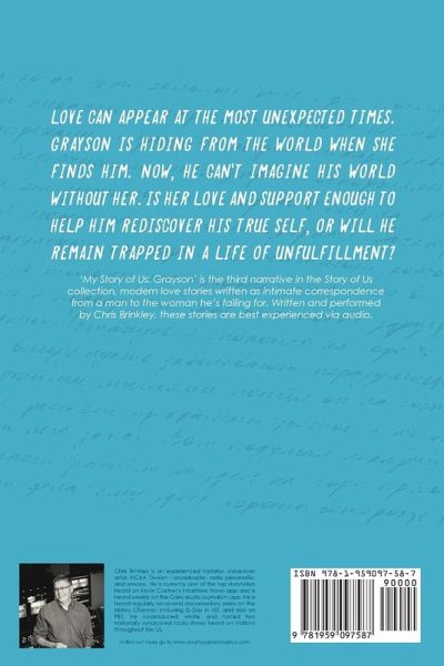 Love can appear at the most unexpected times. Grayson is hiding from the world when she finds him. Now, he can't imagine his world without her. Is her love and support enough to help him rediscover his true self, or will he remain trapped in a life of unfulfillment? My Story of Us: Grayson is the third narrative in the Story of Us collection, modern love stories written as intimate correspondence from a man to the woman he is in love with. Written and performed by Chris Brinkley, these stories are best experienced via audio.