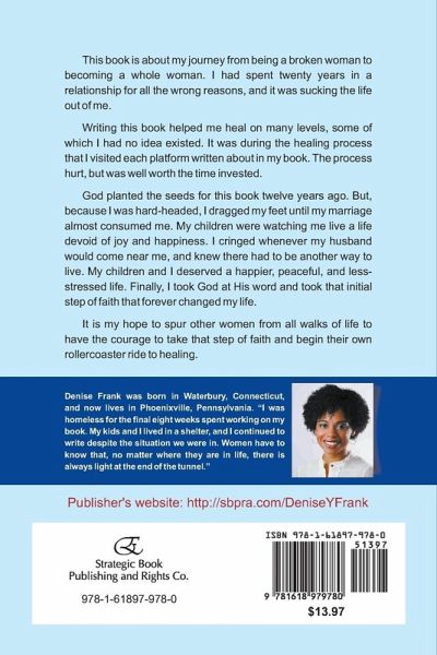 This book is about my journey from being a broken woman to becoming a whole woman. I had spent twenty years in a relationship for all the wrong reasons, and it was sucking the life out of me. Writing this book helped me heal on many levels, some of which I had no idea existed. It was during the healing process that I visited each platform written about in my book. The process hurt, but was well worth the time invested. God planted the seeds for this book twelve years ago. But, because I was hard-headed, I dragged my feet until my marriage almost consumed me. My children were watching me live a life devoid of joy and happiness. I cringed whenever my husband would come near me, and knew there had to be another way to live. My children and I deserved a happier, peaceful, and less-stressed life. Finally, I took God at His word and took that initial step of faith that forever changed my life. It is my hope to spur other women from all walks of life to have the courage to take that step of faith and begin their own rollercoaster ride to healing. Denise Frank was born in Waterbury, Connecticut, and now lives in Phoenixville, Pennsylvania. "I was homeless for the final eight weeks spent working on my book. My kids and I lived in a shelter, and I continued to write despite the situation we were in. Women have to know that, no matter where they are in life, there is always light at the end of the tunnel."