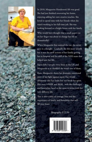 In 2018, Marguerite Henderson's life was good. She had just finished renovating her home, enjoying adding her own creative touches. She loved to spend time with her friends when she wasn't working in her full-time job. She was looking forward to a bright future with her family. Who would have thought that a small paper-cut on her finger was about to change her life so dramatically? When Marguerite first noticed the cut, she never gave it a thought. Gradually she felt more unwell, but it was the swift actions of her family getting her to hospital and the skill of the NHS team that helped save her life. Sepsis kills 5 people every hour in the UK and Marguerite is so thankful she wasn't one of them. Here, Marguerite shares her dramatic, emotional story of her fight against sepsis that would ultimately take her limbs but not break her spirit. Her story is RAW and REAL, with the challenges and heartaches faced as she came to terms with her very different life. This is also a story of courage, love and the importance of family and friendship that will fill your heart.