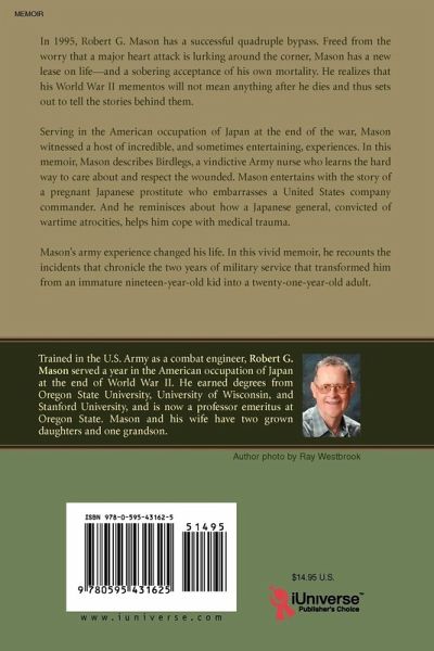 In 1995, Robert G. Mason has a successful quadruple bypass. Freed from the worry that a major heart attack is lurking around the corner, Mason has a new lease on life-and a sobering acceptance of his own mortality. He realizes that his World War II mementos will not mean anything after he dies and thus sets out to tell the stories behind them. Serving in the American occupation of Japan at the end of the war, Mason witnessed a host of incredible, and sometimes entertaining, experiences. In this memoir, Mason describes Birdlegs, a vindictive Army nurse who learns the hard way to care about and respect the wounded. Mason entertains with the story of a pregnant Japanese prostitute who embarrasses a United States company commander. And he reminisces about how a Japanese general, convicted of wartime atrocities, helps him cope with medical trauma. Mason's army experience changed his life. In this vivid memoir, he recounts the incidents that chronicle the two years of military service that transformed him from an immature nineteen-year-old kid into a twenty-one-year-old adult.