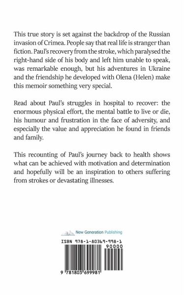 This true story is set against the backdrop of the Russian invasion of Crimea. People say that real life is stranger than fiction. Paul's recovery from the stroke, which paralysed the right-hand side of his body and left him unable to speak, was remarkable enough, but his adventures in Ukraine and the friendship he developed with Olena (Helen) make this memoir something very special. Read about Paul's struggles in hospital to recover: the enormous physical effort, the mental battle to live or die, his humour and frustration in the face of adversity, and especially the value and appreciation he found in friends and family. This recounting of Paul's journey back to health shows what can be achieved with motivation and determination and hopefully will be an inspiration to others suffering from strokes or devastating illnesses.