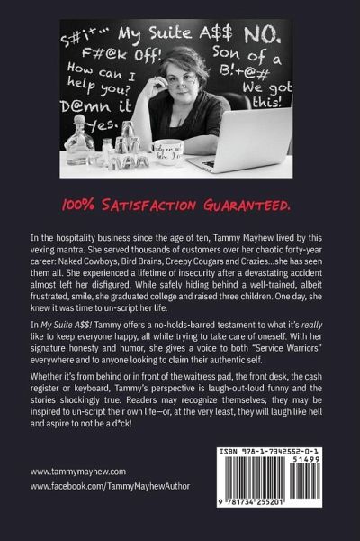 100% Satisfaction Guaranteed. In the hospitality business since the age of ten, Tammy Mayhew lived by this vexing mantra. She served thousands of customers over her chaotic forty-year career: Naked Cowboys, Bird Brains, Creepy Cougars and Crazies…she has seen them all. She experienced a lifetime of insecurity after a devastating accident almost left her disfigured. While safely hiding behind a well-trained, albeit frustrated, smile, she graduated college and raised three children. One day, she knew it was time to un-script her life. In My Suite A$$! Tammy offers a no-holds-barred testament to what it's really like to keep everyone happy, all while trying to take care of oneself. With her signature honesty and humor, she gives a voice to both "Service Warriors" everywhere and to anyone looking to claim their authentic self. Whether it's from behind or in front of the waitress pad, the front desk, the cash register or keyboard, Tammy's perspective is laugh-out-loud funny and the stories shockingly true. Readers may recognize themselves; they may be inspired to un-script their own life-or, at the very least, they will laugh like hell and aspire to not be a d*ck!