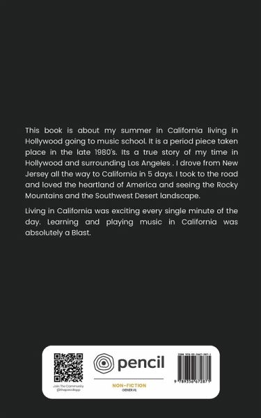 This book is about my summer in California living in Hollywood going to music school. It is a period piece taken place in the late 1980's. Its a true story of my time in Hollywood and surrounding Los Angeles . I drove from New Jersey all the way to California in 5 days. I took to the road and loved the heartland of America and seeing the Rocky Mountains and the Southwest Desert landscape. Living in California was exciting every single minute of the day. Learning and playing music in California was absolutely a Blast.