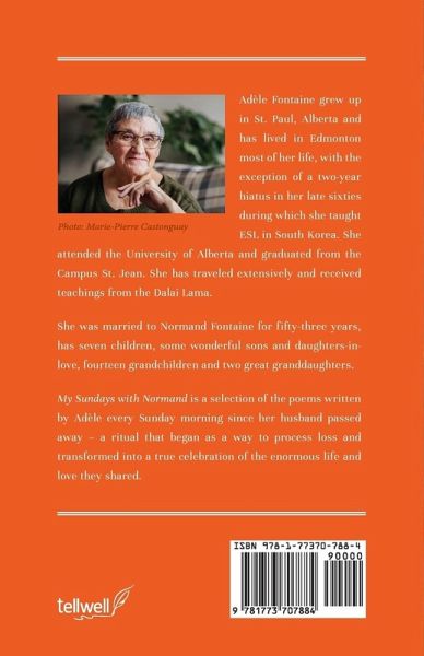 Adèle Fontaine grew up in St. Paul, Alberta, and has lived in Edmonton most of her life, with the exception of a two-year hiatus in her late sixties during which she taught ESL in South Korea. She attended the University of Alberta and graduated from the Campus Saint-Jean. She has travelled extensively and received teachings from the Dalai Lama. She was married to Normand Fontaine for fifty-three years, has seven children, some wonderful sons and daughters-in-love, fourteen grandchildren and two great-granddaughters. My Sunday with Normand is a selection of the poems written by Adèle every Sunday morning since her husband of 53 years passed away - a ritual that began as a way to process loss, and transformed into a true celebration of the enormous life and love they shared.