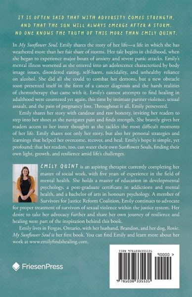 It is often said that with adversity comes strength, and that the sun will always emerge after a storm. No one knows the truth of this more than Emily Quint. In My Sunflower Soul, Emily shares the story of her life-a life in which she has weathered more than her fair share of storms. Her tale begins in childhood, when she began to experience major bouts of anxiety and severe panic attacks. Emily's mental illness worsened as she entered into an adolescence characterized by body image issues, disordered eating, self-harm, suicidality, and unhealthy reliance on alcohol. She did all she could to combat her demons, but a new obstacle soon presented itself in the form of a cancer diagnosis and the harsh realities of chemotherapy that came with it. Emily's earnest attempts to find healing in adulthood were countered yet again, this time by intimate partner violence, sexual assault, and the pain of pregnancy loss. Throughout it all, Emily persevered. Emily shares her story with candour and raw honesty, inviting her readers to step into her shoes as she navigates pain and finds strength. She bravely gives her readers access to her inner thoughts as she tackles the most difficult moments of her life. Emily shares not only her story, but also her personal strategies and learnings that helped her overcome, recover, and heal. Emily's hope is simple, yet profound: that her readers, too, can water their own Sunflower Souls, finding their own light, growth, and resilience amid life's challenges.