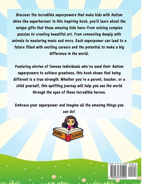 Every person is unique, with their own special abilities that make them who they are. But did you know that some kids have superpowers that make them stand out in incredible ways? Kids with Autism are like superheroes in our world, each with a special gift that helps them see, hear, and feel the world differently. This book is about discovering those superpowers. Whether it's a talent for music, an eye for detail, or a heart full of kindness, these superpowers can lead to amazing careers and incredible achievements. Just like famous people who've used their Autism superpowers to change the world, every child has the potential to do something extraordinary. So, let's celebrate these unique superpowers and imagine the incredible things you can do with yours. Because being different isn't just okay-it's what makes you super!