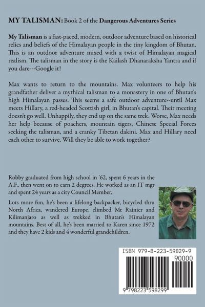 MY TALISMAN: Book 2 of the Dangerous Adventures Series Adventure Meets Magical Realism in the Himalayas Still recovering from the Mount Rainier tragedy, Max yearns to return to the mountains. But little does he know, his next expedition will push him to the brink of an even greater test - one cloaked in ancient Himalayan mysticism. When Max's grandfather agrees to deliver a powerful relic to a remote monastery in Bhutan, Max seizes the chance to come along. At first, it seems like a straightforward trek through the treasured valley kingdom. That is, until Max crosses paths with Hillary, a fiery Scottish redhead as skilled at scaling rocks as she is at getting under Max's skin. The two climbing hotshots instantly clash...until they realize they need each other's help to survive the unexpected dangers arising. Ruthless poachers, a corrupt Bhutanese official, and Chinese Special Forces have all set their sights on the sacred relic Max's grandfather carries - an artifact rumored to unleash incredible abilities for its bearer. Worse still, a cranky Bhuddist dakini believes the talisman belongs to her alone. Now Max must do what he vowed never to do again - put his life on the line, this time navigating a realm where the magical and modern worlds perilously collide. In Book 2 of the Dangerous Adventure Series, author Robby Robertson draws from his own treks through Bhutan to immerse readers in a high-altitude, high-stakes thriller meshing real-life adventure with Himalayan mystical lore. As Max pursues both the physical and metaphysical challenges before him, he must decide what he's willing to risk for his promise to return the relic to its home. When Himalayan mysticism becomes real, will Max and Hillary have the fortitude to make it down alive?
