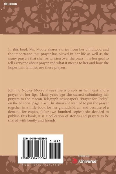 In this book Ms. Moore shares stories from her childhood and the importance that prayer has played in her life as well as the many prayers that she has written over the years, it is her goal to tell everyone about prayer and what it means to her and how she hopes that families use these prayers.