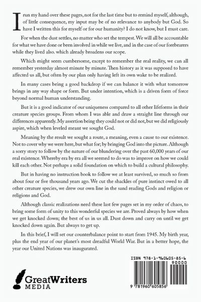 I run my hand over these pages, not for the last time but to remind myself, although, of little consequence, my input may be of no relevance to anybody but God. So have I written this for myself or for our humanity? I do not know, but I must care.For when the dust settles, no matter who set the tempest. We will all be accountable for what we have done or been involved in while we live, and in the case of our forebearers while they lived also. which already broadens our scope.Which might seem cumbersome, except to remember the real reality, we can all remember yesterday almost minute by minute. Then history as it was supposed to have affected us all, but often by our plan only having left its own wake to be realized.In many cases being a good backdrop if we can balance it with what tomorrow brings in any way shape or form. But under intention, which is a driven form of force beyond normal human understanding.But it is a good indicator of our uniqueness compared to all other lifeforms in their creature species groups. From whom I was able and draw a straight line through our differences apparently. My assertion being they could not or did not, but we did religiously aspire, which when leveled meant we sought God.Meaning by the result we sought a route, a meaning, even a cause to our existence. Not to cover why we were here, but what for; by bringing God into the picture. Although a sorry story to follow by the nature of our blundering over the past 60,000 years of our real existence. Whereby era by era all we seemed to do was to improve on how we could kill each other. Not perhaps a solid foundation on which to build a cultural philosophy.But in having no instruction book to follow we at least survived, so much so from about four or five thousand years ago. We cut the shackles of pure instinct owed to all other creature species, we drew our own line in the sand reading Gods and religion or religions and God.Although classic realizations need these last few pages set in my order of chaos, to bring some form of unity to this wonderful species we are. Proved always by how when we get knocked down; the best of us in us all. Dust down and carry on until we get knocked down again. But always to get up.In this brief, I will set our counterbalance point to start from 1945. My birth year, plus the end year of our planet's most dreadful World War. But in a better hope, the year our United Nations was inaugurated.